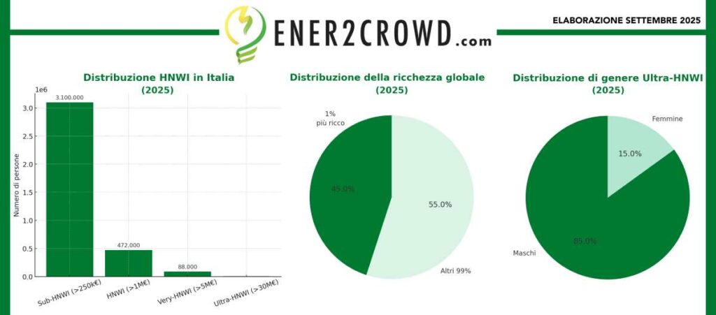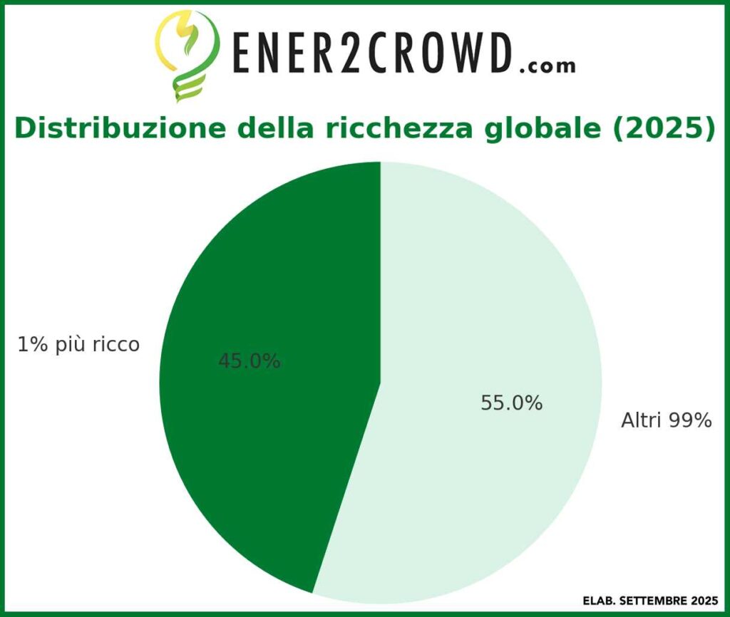 A livello globale —osserva Ener2Crowd— il patrimonio complessivo dei miliardari ha avuto un incremento del +138% dal 2015 al 2025, passando da 6.300 a 15 mila miliardi. Ma è solol’1% più ricco della popolazione mondiale a detenere il 45% della ricchezza totale.