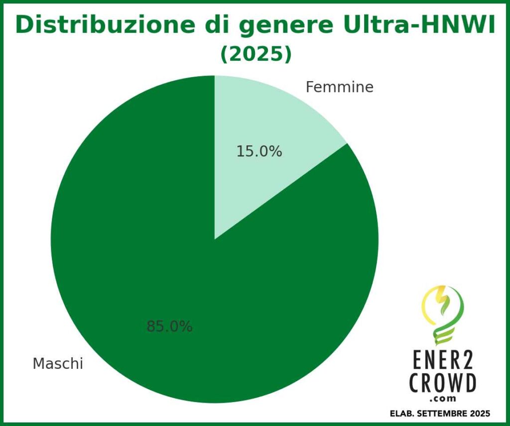 In quanto alla demografia, l’85% degli ultra ricchi è di sesso maschile, mentre solo il 15% è di sesso femminile, con un’età media di 62 anni per gli uomini e di 50 anni per le donne. «E tra gli ultra-HNWI italiani ci sono anche 2.200 italiani che superano i 100 milioni di euro» aggiungono gli analisti di Ener2Crowd, che tra i nostri connazionali registrano anche 67 miliardari su un totale mondiale di 2.400.