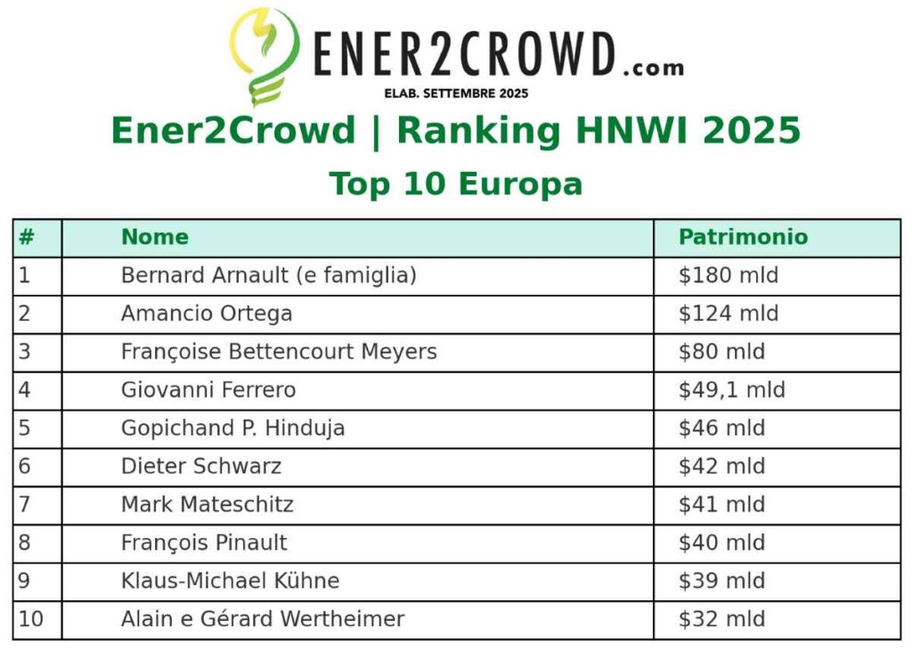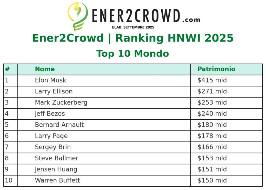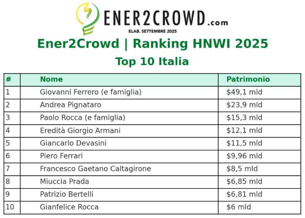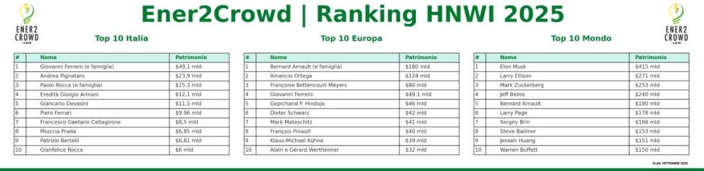Ecco dunque il Ranking HNWI 2025 di Ener2Crowd, diviso in 3 ambiti territoriali, con la top-10 Italia, Europa e mondo.